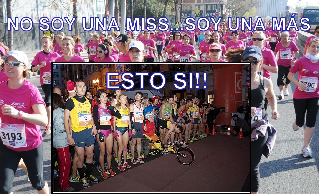 Pero yo..una chica cualquiera a la que nadie hace caso y con muy poco poder de convicción seguirá año tras año igual gritando los mas fuerte que pueda para acabar con estas trapalladas que se inventan y jamas acudiré a una carrera de la mujer ,triatlon de la mujer ni "rosismos varios" ni jamas formare parte de un club o de una actividad "Solo para mujeres"