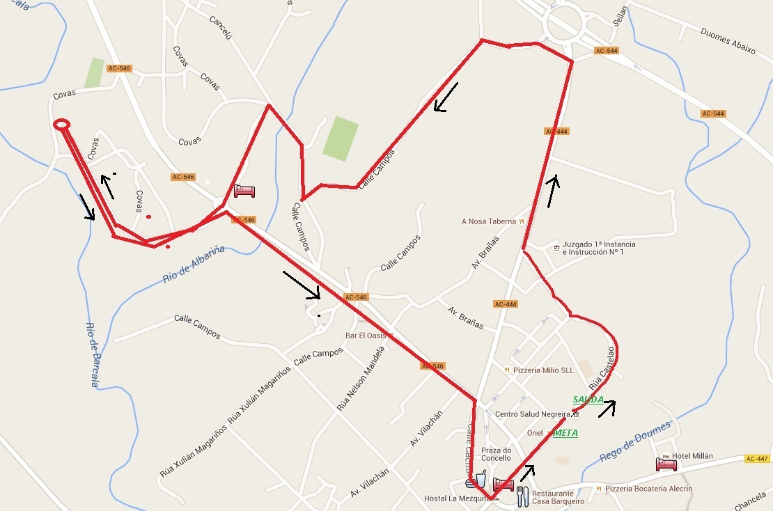 Saida Centro medico -> Instituto ->Avda Brañas ->rotonda de Ceilan ->piscina de Negreira -> Ponte de Covas -> Servicio movil -> Punto Limpo (control de chip) ->ac546 campos ->Avenida de Barcala ->Cachurra -> Rua do Carmen (Concello) ->Centro médico.