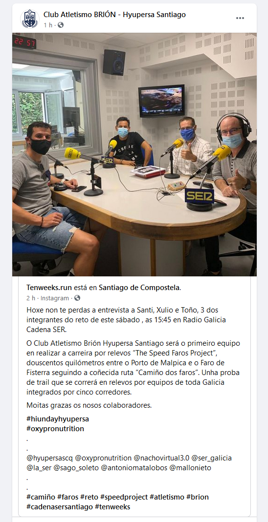 O patrocinador principal do club, o concesionario Hyupersa Santiago, colabora unha vez mais con nos cedendo duas unidades do novo Hyundai KONA electrico que serviran de apoio durante a proba. Este vehículo é o primeiro SUV compacto de Europa 100% electrico e combina unha incrible autonomía de aproximadamente 450km co estilo espacioso e cheo de carácter própio dun SUV. Con estes dous vehículos de apoio totalmente electricos o Club Atletismo Brión Huypersa Santiago reforza novamente a súa aposta polo respecto ao medio ambiente e a sostenibilidade do planeta.