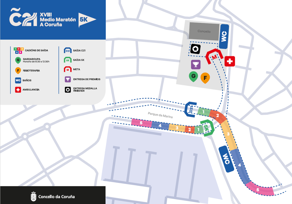 Si algún/a participante, por motivos de fuerza mayor, con causas debidamente justificadas, no puede recoger su dorsal ni tiene a nadie que lo pueda hacer en su lugar en las fechas establecidas, deben ponerlo en conocimiento en el correo direccion.deportes @ coruna.gal