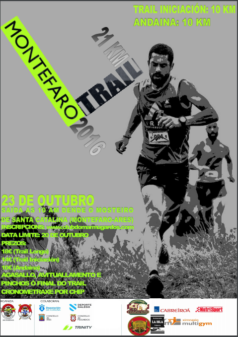 TRAIL MUGARDOS-MONTEFARO. PRUEBA QUE DISCURRIRÁ POR LA MONTAÑA MONTEFARO, DE VISTAS INMEJORABLES E INMEJORABLE TERRENO. PROMETEMOS MEJORAR E IMPRESIONAR EN NUESTRO RECORRIDO PERO HACIENDOLO APTO PARA TODOS LO PÚBLICOS. TENDREMOS, AL IGUAL QUE EN LA EDICIÓN 2015, TRAIL CORTO, PARA LOS QUE SE QUIERAN INICIAR O CORRER MENOS DISTANCIA.